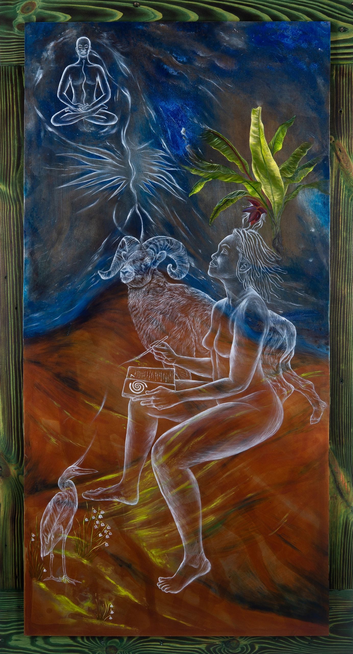 acid patina, oxide, mica powder, bronze metal coating & oil paint on rusted steel plate, pallet wood